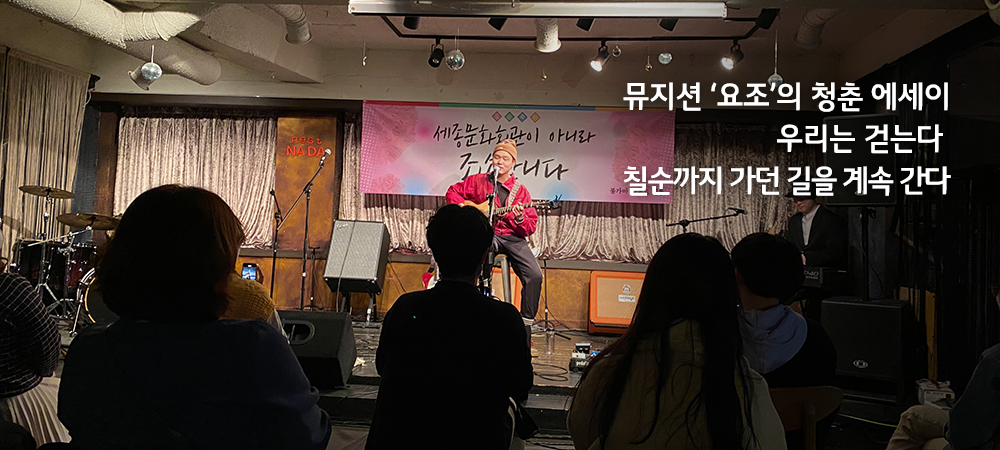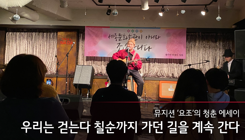 <누군가의 칠순잔치> 무대 위에는 ‘세종문화회관이 아니라 죄송합니다.’라고 적힌 현수막이 걸려 있었다. 누군가의 말실수가 불러온 쓸쓸한 풍자 공연을 앞두고 마냥 웃을 수 없는 기분이었지만 분위기는 시종일관 발랄했다. 한 밴드의 순서가 끝나고 다음 밴드가 준비하는 동안에는 ‘내 나이가 어때서’ 가 흘러나왔고, 한복을 곱게 입으셨던 직원분께서 그사이 마이크와 무대 곳곳을 민첩하게 소독했다.