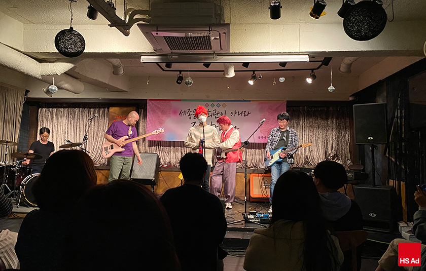 <누군가의 칠순잔치> 무대 위에는 ‘세종문화회관이 아니라 죄송합니다.’라고 적힌 현수막이 걸려 있었다. 누군가의 말실수가 불러온 쓸쓸한 풍자 공연을 앞두고 마냥 웃을 수 없는 기분이었지만 분위기는 시종일관 발랄했다. 한 밴드의 순서가 끝나고 다음 밴드가 준비하는 동안에는 ‘내 나이가 어때서’ 가 흘러나왔고, 한복을 곱게 입으셨던 직원분께서 그사이 마이크와 무대 곳곳을 민첩하게 소독했다.