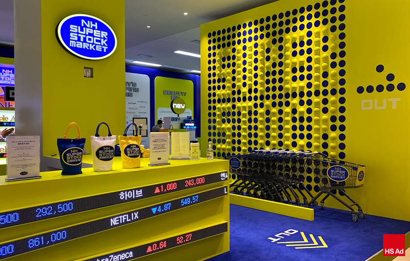 상반기 가장 힙한 장소라는 여의도 ‘더 현대 서울’과 요즘 2030세대에게 가장 큰 관심사인 주식 투자 콘텐츠가 만났습니다. 핫한 장소와 콘텐츠가 만나 MZ세대의 호기심을 자극하는 이곳은 NH투자증권에서 운영하는 특별한 슈퍼마켓인데요. 무형의 금융 상품을 가지고 만든 매장이라는 점만으로도 궁금증을 불러일으킵니다. NH투자증권의 본사 이전에 맞춰 병행 마케팅의 일환으로 기획된 NH슈퍼스톡마켓은 투자 쇼핑이라는 콘셉트로 실제 슈퍼마켓에서 물건을 고르듯 전시된 주식 종목을 물건처럼 매수하는 ‘주식 쇼핑 체험’을 할 수 있는 공간입니다. 실제 방문해 본 NH슈퍼스톡마켓은 브랜드 컬러인 블루, 옐로 컬러를 사용해 밝고 경쾌하게 표현한 인테리어와 요즘 젊은 세대들이 선호하는 기업 종목들로 꾸민 디스플레이 및 감각적인 포토존 등 인스타그래머블함을 추구하는 MZ에게 충분히 매력적인 공간이었는데요. 특히 비치된 스마트폰을 이용하여 선물 받은 1억원으로 가상모의투자를 진행하고 그 결과에 따라 경품을 증정해 방문객들의 적극적인 참여를 유도하는 점이 인상 깊었습니다. 더불어 실제 주식 투자를 원하는 고객들은 매장 한쪽에 별도로 위치한 화상상담부스를 통해 금융 전문가와 화상으로 비대면 투자 상담도 가능합니다. 평소에 관심이 있었으나 너무 어렵다고 느꼈던 사람뿐만 아니라 자녀에게 경제 공부를 시키고 싶은 분들의 방문도 많다고 하는데요. NH투자증권은 팝업스토어의 신선하고 재미난 체험을 통해, 젊고 참신한 브랜드 이미지를 효과적으로 전달하고 있었습니다.