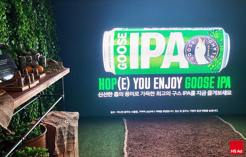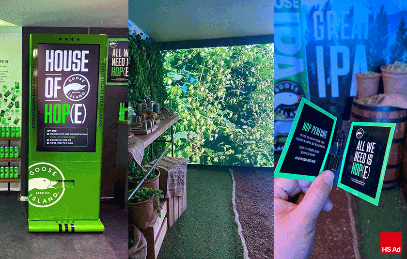 최근 매장들의 공실률이 늘면서 가로수길이 팝업스토어의 주요 무대가 되고 있습니다. 구스아일랜드도 가로수길 메인 위치에 하우스 오브 홉 캠페인을 선보였는데요. 구스아일랜드는 오랜 시간을 견뎌낸 홉이 최고의 구스 IPA가 되는 것처럼, 다시 평범한 일상을 영위할 수 있길 바라는 모두의 희망(Hope)을 담아 이번 하우스 오브 홉 캠페인을 진행하게 되었다고 합니다. 팝업 공간은 굿즈와 SNS공유 이벤트 위주로 꾸며진 1층과 전문 도슨트와 함께 브랜드의 다양한 스토리와 제품을 실제 체험해 볼 수 있는 2층으로 구성되어 있는데요. 1층에서는 한정판 제품 구매도 가능하며, 비치된 물품들을 활용해 나만의 희망 메시지를 넣은 커스터마이징 Hop(e) IPA 캔 만들기 및 포토존을 활용한 다양한 SNS 공유 이벤트를 진행하고 있었습니다. 지정된 시간에 제한된 인원으로 입장 가능한 2층은 구스아일랜드의 엘크마운틴 홉 농장을 재현한 컨셉존으로 만들어졌는데요. 제품에 사용되는 홉을 직접 만져보고 향도 맡아보면서, 브랜드의 히스토리와 철학에 대해 알아보고 시음도 해보는 의미 있는 시간을 경험하게 합니다.