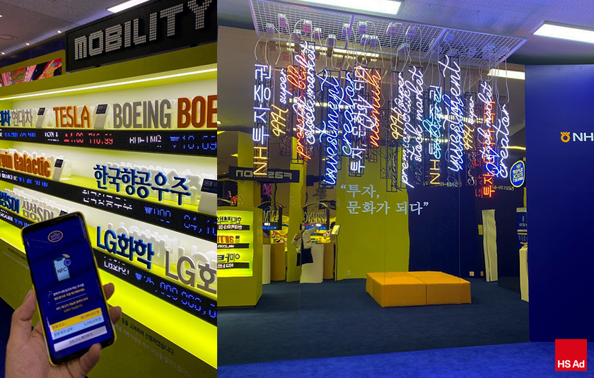 상반기 가장 힙한 장소라는 여의도 ‘더 현대 서울’과 요즘 2030세대에게 가장 큰 관심사인 주식 투자 콘텐츠가 만났습니다. 핫한 장소와 콘텐츠가 만나 MZ세대의 호기심을 자극하는 이곳은 NH투자증권에서 운영하는 특별한 슈퍼마켓인데요. 무형의 금융 상품을 가지고 만든 매장이라는 점만으로도 궁금증을 불러일으킵니다. NH투자증권의 본사 이전에 맞춰 병행 마케팅의 일환으로 기획된 NH슈퍼스톡마켓은 투자 쇼핑이라는 콘셉트로 실제 슈퍼마켓에서 물건을 고르듯 전시된 주식 종목을 물건처럼 매수하는 ‘주식 쇼핑 체험’을 할 수 있는 공간입니다. 실제 방문해 본 NH슈퍼스톡마켓은 브랜드 컬러인 블루, 옐로 컬러를 사용해 밝고 경쾌하게 표현한 인테리어와 요즘 젊은 세대들이 선호하는 기업 종목들로 꾸민 디스플레이 및 감각적인 포토존 등 인스타그래머블함을 추구하는 MZ에게 충분히 매력적인 공간이었는데요. 특히 비치된 스마트폰을 이용하여 선물 받은 1억원으로 가상모의투자를 진행하고 그 결과에 따라 경품을 증정해 방문객들의 적극적인 참여를 유도하는 점이 인상 깊었습니다. 더불어 실제 주식 투자를 원하는 고객들은 매장 한쪽에 별도로 위치한 화상상담부스를 통해 금융 전문가와 화상으로 비대면 투자 상담도 가능합니다. 평소에 관심이 있었으나 너무 어렵다고 느꼈던 사람뿐만 아니라 자녀에게 경제 공부를 시키고 싶은 분들의 방문도 많다고 하는데요. NH투자증권은 팝업스토어의 신선하고 재미난 체험을 통해, 젊고 참신한 브랜드 이미지를 효과적으로 전달하고 있었습니다.