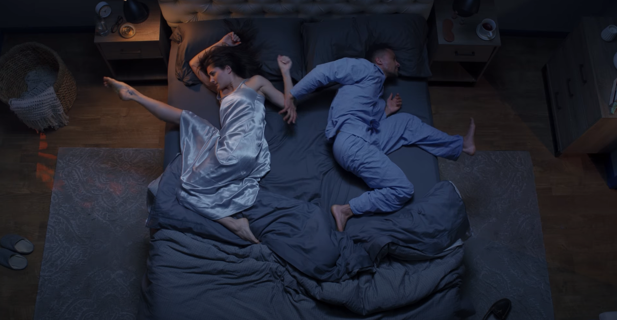 침대에 누워있는 부부는 근육통과 두통에 몸부림칩니다. 잠에 쉽사리 들지 못해 신경질도 내며 고통스러워하죠. 이리저리 자세를 바꿔보지만 효과는 나타나지 않습니다. 부부는 침대 위에서 탱고를 추는 듯 신나는 노래에 맞춰 칼군무를 선보입니다.