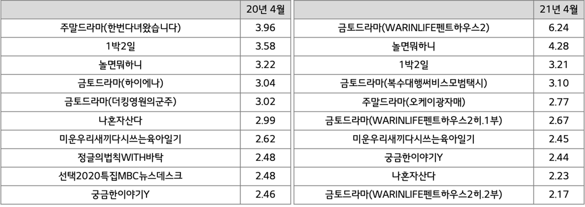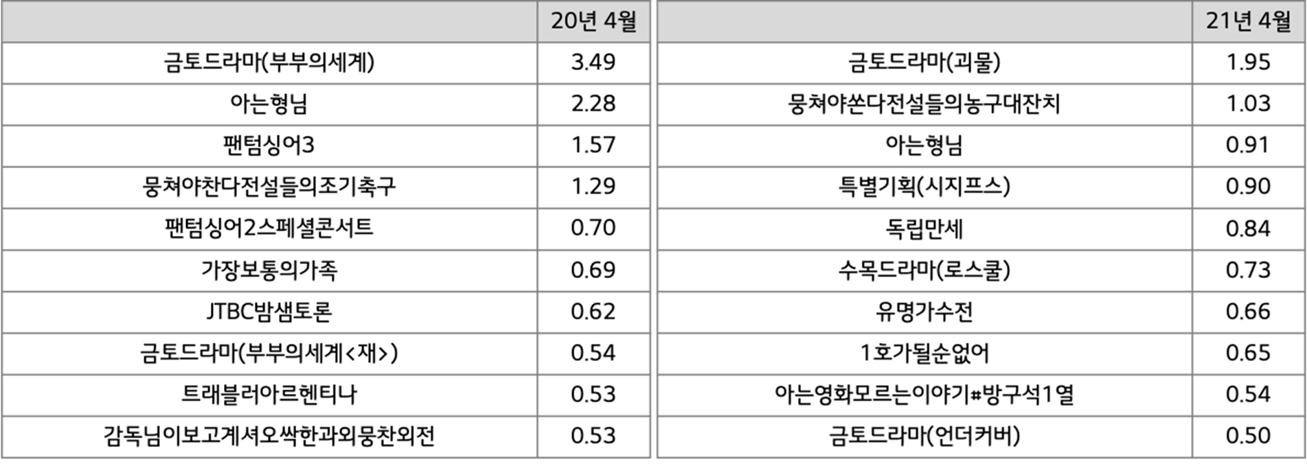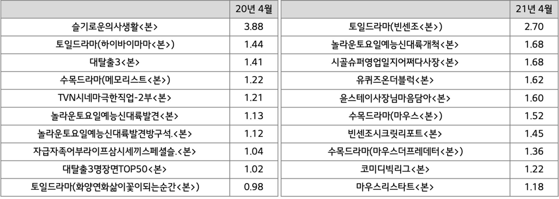 지상파가 가진 채널 대표성도 그렇지만, JTBC는 작년 동기 절대 이슈를 보였던 금토 드라마 “부부의 세계” 이후 뚜렷한 이슈작이 없었던 점이 좀 더 크게 반영된 것으로 보이고, tvN은 금요 예능과 주말드라마가 나름 시즌마다 시청률을 견인해 주고 있다는 점 때문이다.