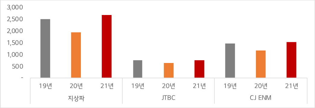 2019년은 매년 증가하던 보너스율이 다소 주춤하기 시작한 해로서, 보너스율의 한계를 가늠할 수 있었던 해였는데, 19년 대비해서도 현재 방송 시장은 활황으로 보인다. 특히 이슈성이 집중된 지상파는 그간 영향력 하락의 오명에도 여타 케이블 주요 채널 대비 상승율이 38% 수준으로 가장 눈에 띈다. 또 최근 시청률 부침을 겪고 있는 JTBC도 역시 19년 대비 17% 정도 매출이 증가하고 있어 특정 매체에 편중된 증가가 아닌, 21년 상반기는 본격적인 시장 회복으로 볼 수 있다.