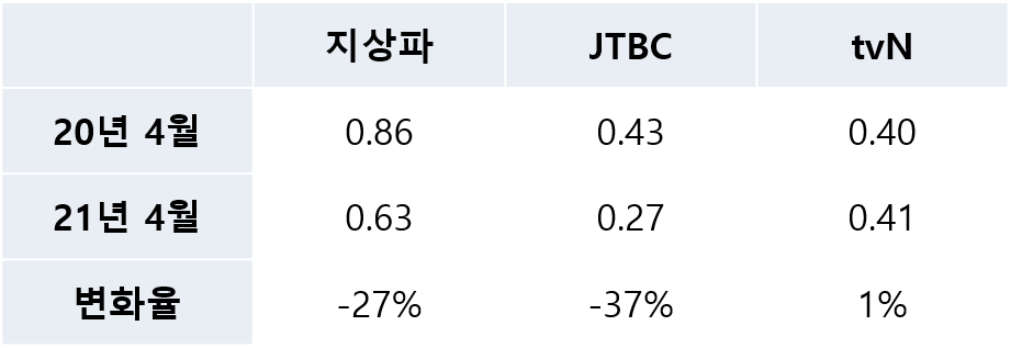 지상파가 가진 채널 대표성도 그렇지만, JTBC는 작년 동기 절대 이슈를 보였던 금토 드라마 “부부의 세계” 이후 뚜렷한 이슈작이 없었던 점이 좀 더 크게 반영된 것으로 보이고, tvN은 금요 예능과 주말드라마가 나름 시즌마다 시청률을 견인해 주고 있다는 점 때문이다.