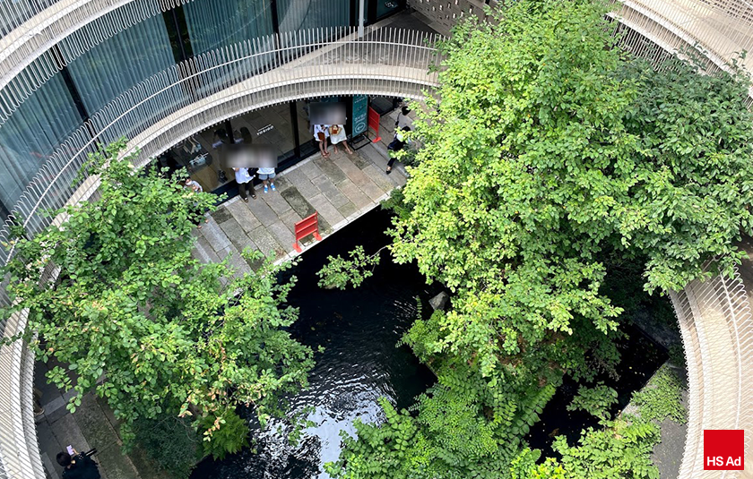 덕분에 우리는 건물의 본래 목적인 사옥으로 활용되기 전, 아름다운 건축과 그 속에서 즐기는 매력적인 콘텐츠 경험을 함께 즐길 수 있게 되었죠. 이 공간의 매력은 원통 형태의 중정을 품고 있는 건축이 주는 경험인데요. 브릭웰은 건물을 관통하는 중정을 만들고 1층을 필로티로 설계하였습니다. 중심에 있는 나무와 아담한 연못으로 이루어진 중정은 누구든 골목을 걷다가 들어와 휴식을 취할 수 있는 도심 속 휴식 공간의 역할을 하고 있는데요. 내부 설계도 벽을 최대한 줄여서 어느 위치에서도 중정이 보일 수 있도록 의도했다고 합니다.