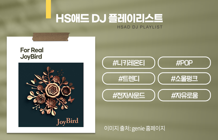 소울, 팝, 펑크의 다양한 장르를 조합해 독보적인 매력과 에너지로 소화하는 싱어송라이터 니키레온티(Nikki Leonto)가 새로운 음악 여정을 시작하기 위해 JoyBird의 이름으로 나타났습니다. 자유롭고 트렌디한 전자 사운드와 심장박동을 닮은 비트, 재즈풍의 소울풀한 보컬이 조화로운 ‘For Real’은 스트리밍과 동시에 몸이 들썩거리는 흥을 유발합니다.