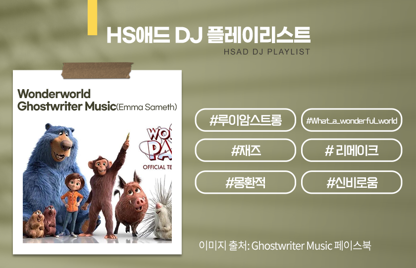 두껍고 카리스마 넘치는 보이스로 재즈의 역사를 쓴 루이암스트롱의 ‘What a wonderful world’가 미국의 싱어송라이터 Emma Sameth의 가녀리고 몽환적인 음색을 만나 전혀 다른 분위기의 곡으로 재탄생했습니다. 편곡된 ‘Wonderworld’는 애니메이션 영화 (한국 제목: 원더월드)의 티저영상에서 주인공 소녀인 존이 상상 속 놀이공원을 숲에서 발견하는 순간 흘러나오며 환상적인 스토리를 예상하게 하죠.