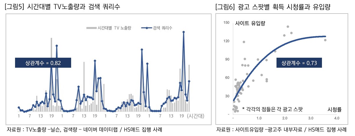 그리고 더 나아가, 이런 노출-검색-구매의 성공적인 전환 성과를 보여주는 TV 광고를 어떻게 하면 더 잘 활용할 수 있을지의 관점에서 여러 가지 가설을 세우고 검증해 보고 있다. 업종별 전환의 효율성이 두드러지는 TV 노출량 레벨 수준, 이러한 전환이 채널/요일/시간대/프로그램 시청률과 양의 상관관계가 있는지 등의 가설을 HS애드의 TV 집행 전술로 업그레이드하고 있는 중이다. [그림 5&6 참고]