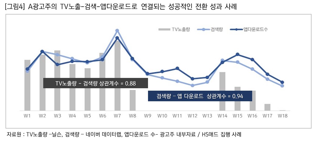 그중 A 광고주의 경우, 방송광고가 온에어 됨과 동시에 관련 검색 쿼리가 유의적으로 상승했을 뿐 아니라 종료 시점에는 앱 다운로드 수 목표까지 달성할 수 있었다. 이 캠페인의 노출-검색-앱 다운로드의 상관계수2)는 각 단계별로 무려 0.88, 0.94 라는 높은 수치로 HS애드의 성공적인 전환 성과 사례로 기록되고 있다.[그림4 참고]