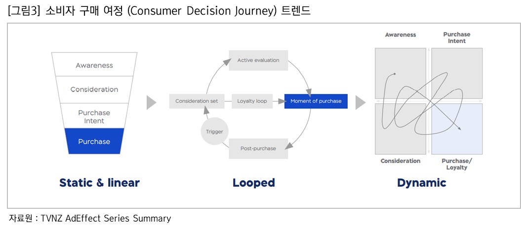 디지털 시대가 가속화되면서 다양한 접점들을 통해 얻게 되는 수많은 정보로 인해 소비자들이 결정을 내리는 방식은 점점 더 복잡해지고 있다. 과거 선형적인 구매 단계일 때는 TV는 인지 단계, 디지털은 구매 유도 단계를 전담한다고 이분법적으로 나누어 생각하기도 했지만 [그림3]과 같이 구매 여정이 좀 더 다양하고 비 정형화되면서 그 경계를 구분하는 것이 무의미해졌다. 즉, 이제는 소비자의 여정을 이해하고 매체 간 통합적 분석을 통해 각 매체들을 어떤 방식으로 연결해야 시너지를 낼 수 있는지 고민해야 한다는 것이다. 따라서 인지부터 최종 구매까지 이루어지도록 매체 간 유기적 연계 디자인이 필요하다.