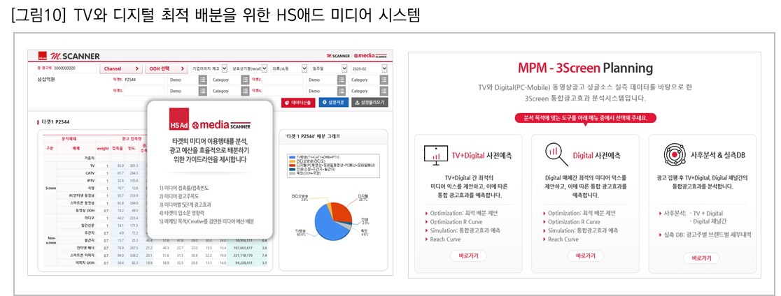 닐슨코리아의 3Screen 실측 데이터를 바탕으로 2014년 대행사 최초로 개발한 MPM (Multi-Platform Measurement)을 활용하여 크게는 TV+디지털 또는 디지털 단독 캠페인의 효과를 사전 예측과 사후 분석으로 나누어 확인할 수 있다. 최적 믹스율을 위한 사전 예측에서 Simulation뿐 아니라 Optimization(최적 배분)까지 확인할 수 있고 디지털 세부 믹스에서는 채널별(유튜브, SMR 등) 예산 배분까지 가능하다. 또한 좀 더 정확한 예측을 위해 매체별 집행 초수 및 Creative 이슈에 따라 달라지는 재생 완료율을 포함하는 로직 등을 반영하고 지속 업그레이드 하면서 HS애드는 업계의 3Screen 통합 효과 시스템 고도화 작업을 리드해 오고 있다.