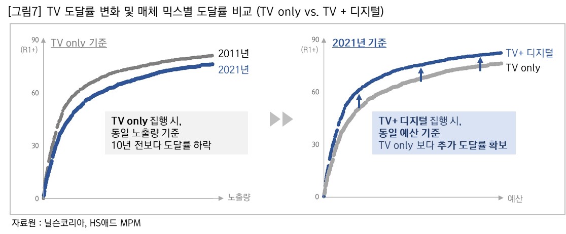 최근 디지털 기기만으로 콘텐츠를 소비하는 사람들이 늘어나면서 예전과 달리 TV로 커버하지 못하는 타깃이 늘어나고 있다. 이로 인해 과거와 동일한 노출량 기준, 획득 가능한 도달률(Reach)은 낮아지고 있는 추세이다. 여기에 대한 대응으로 디지털과의 믹스를 통해 추가 도달률(Incremental Reach)을 확보하고 있는데, 이렇게 과거 대비 잃어버린 도달률을 찾기 위해 TV 집행 시 디지털은 필수 집행 매체가 되었다. [그림7 참고]