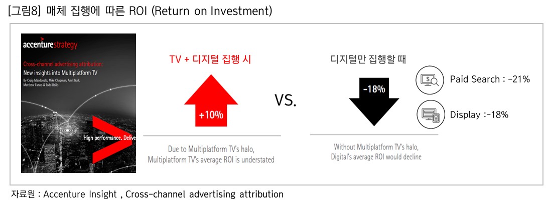 글로벌 컨설팅 회사인 액센츄어(Accenture)가 3년간 6개 업종, 20개 이상의 글로벌 브랜드를 대상으로 TV와 디지털 광고비가 어떻게 브랜드 관련 지표와 세일즈 등에 영향을 미쳤는지 조사하였다. 보고서의 주된 내용은 TV와 디지털 병행 시 ROI는 10% 증가하나, 디지털 단독 집행 시 ROI는 18% 악화된다는 것이었는데, 디지털 내에서도 검색광고의 ROI 하락 비율이 가장 크다는 부분은 꽤나 흥미로운 결과였다. [그림 8 참고]