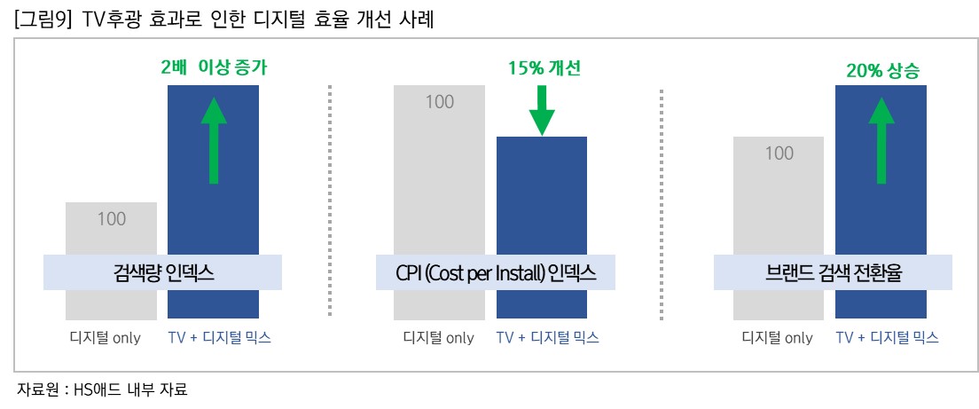 한국 시장 역시 유사한 결과를 보여주는 사례들이 많다. HS애드의 내부 결과 분석 데이터에서도 디지털 단독 집행 보다 TV 광고를 병행했을 때, 검색량 상승뿐 아니라 퍼포먼스 광고 효율성 개선 등의 유기적인 시너지 창출을 확인할 수 있었다. [그림9 참고]