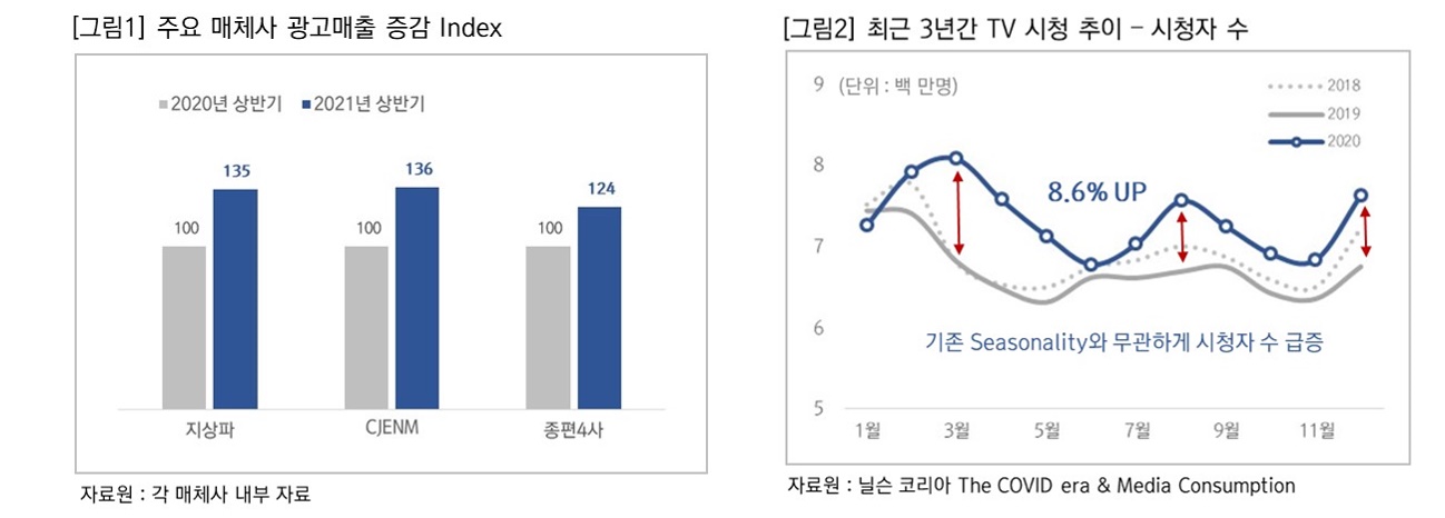2021년 상반기 주요 매체사들의 광고 매출 자료에 따르면, 지상파와 유료방송 TV 광고비가 전년 동기 대비 채널별 낮게는 15%, 높게는 50% 성장하면서 평균 30% 내외의 두 자릿수 증가율을 보여주고 있다. [그림1 참고] 최근 디지털의 매년 이어지고 있는 최고액 경신과 두 자릿수 성장률로 인해 '디지털 first, 디지털 only'라는 말이 생겨날 정도로 디지털 광고가 각광받고 있는 시장이기에 이런 TV 광고비의 역주행이 더 주목받고 있다.
