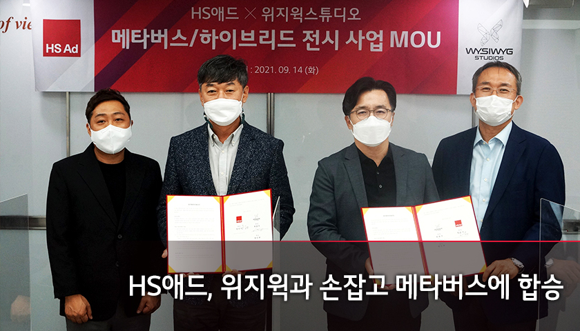 HS애드는 이를 위해 가상융합현실 콘텐츠 제작 솔루션 및 메타버스 플랫폼 구축을 위한 밸류체인으로 급부상중인 위지윅스튜디오 (대표 : 박관우, 박인규)와 지난 9월 14일 업무협약(MOU)을 체결했으며, 협약식을 위해 HS애드에서는 정성수 대표이사와 권창효 AS2사업부문장, 위지윅스튜디오에서는 박관우 대표이사와 김재훈 부사장 등이 참석했습니다.