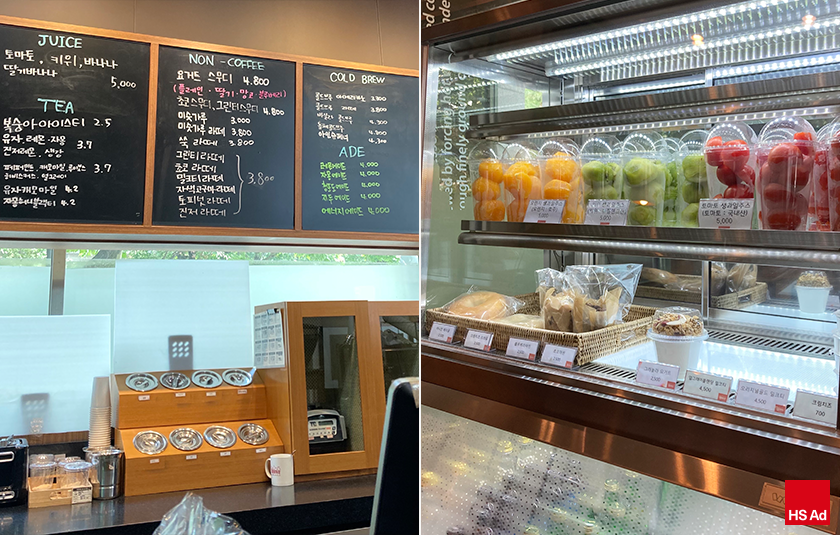 15층 사내 카페에는 음료뿐만 아니라 아침에는 빵, 샐러드, 샌드위치, 김밥 등을 판매합니다. 빵류는 다들 익숙하실 파리바게뜨 제품이라 거부감 없이 드실 수 있고, 김밥은 너무 더운 여름을 제외하고는 판매 중이니 출출한 아침도 금방 든든해집니다. 코로나 이전에는 식빵에 크림치즈, 딸기잼, 땅콩크림 등 여러 가지 잼도 구비되어 있어 가벼운 아침으로 삼기에 좋았는데요. 코로나로 공용 물건을 최대한 줄이는 지금은 어려운 실정입니다. 점심 이후 오후 시간대에는 통상적으로 컵과일도 판매되고 있습니다. 오후에 입이 심심할 때, 과일이 먹고 싶을 때 찾아가 보세요!