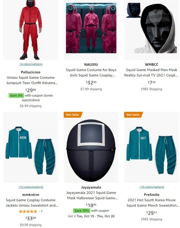 달고나 키트 외에도 해외 온라인 몰에는 <오징어게임> 속 참가자들이 입고 있는 초록색 트레이닝 복과 진행 요원의 옷과 마스크가 인기 상품에 올랐습니다. 실제로 트레이닝복, 달고나, 구슬치기 등과 같은 <오징어게임> 키워드 상품은 3주 만에 1,996% 증가했다고 하는데요. 이러한 인기에 <오징어게임> 속 의상은 올해 가장 인기 있는 전 세계 핼러윈 의상 중 하나가 될 것으로 예상됩니다.