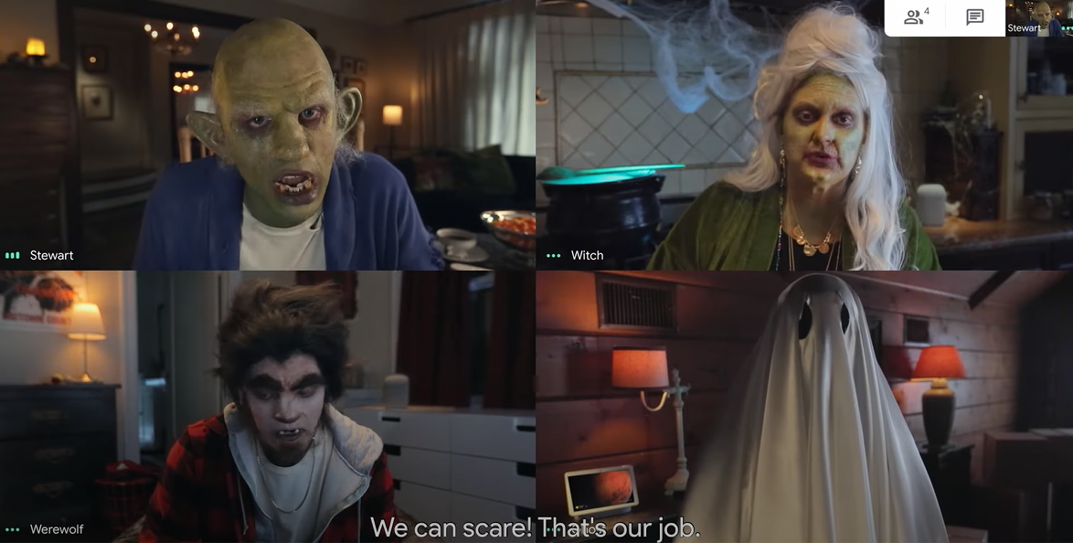 구글은 핼러윈 시즌과 신제품의 특장점을 결합해 유쾌한 광고를 선보였습니다. 네스트 미니, 허브와 같은 다양한 구글 네스트 제품 사용 방법을 유령과 늑대인간, 마법사 네 명의 몬스터들이 알려주는데요. 아래 영상은 핼러윈 시즌을 맞아 몬스터들이 화상회의를 하는 광고 영상입니다.
