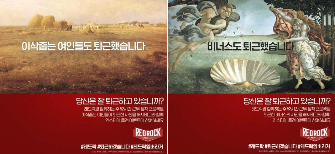 또 하나 송하철 CD가 소개한 캠페인은 바로 2018년 52시간제 도입과 동시에 진행한 앰버라거 레드락입니다. 퇴근이라는 소재와 고전 명화를 연결하며 좋은 반응을 얻었지만, 지금 생각하면 아쉬움도 남는 캠페인이라고 합니다.