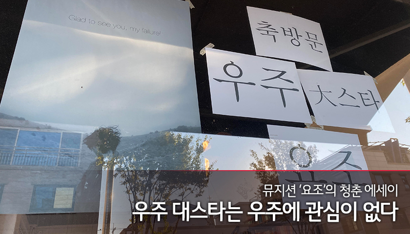 집으로 돌아오는 밤기차 안은 우주를 생각하기에 좋은 공간이었다. 차창으로는 어떻게 시선을 두느냐에 따라 떼꾼한 내 얼굴을 볼 수 있기도, 지폐계수기 속 지폐처럼 깜깜한 어둠 속으로 차라락 미끄러지는 나무와 산의 실루엣을 볼 수 있기도 했다. 나는 그 두 모습을 번갈아 바라보며 ‘우주 대스타’, 대스타 앞에 붙은 ‘우주’ 라는 말의 천연덕스러움에 대해 생각했다. 무언가가 현실성을 초월할 때 되려 시시하고 만만해지는 일에 대해서. 마치 단골 슈퍼에서 물건을 살 때 천 원짜리를 천만 원이라고 말하는 주인아저씨의 농담처럼 ‘우주’라는 말도 실감되지 않아서 늘 사소하고, 가질 수 없으니 늘 장난이 되는 말 같았다. 그래서 나같은 중간 저자에게도 얼마든지 우주 대스타라는 찬사가 어색하지 않은 것일 테다.