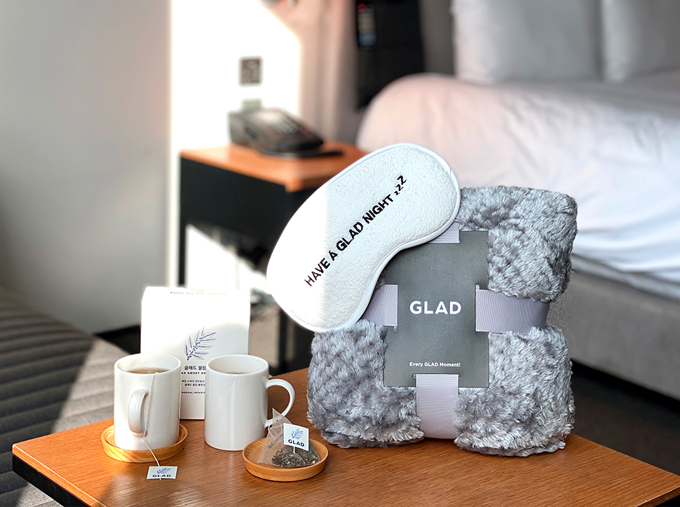 글래드 호텔앤리조트는 프리미엄급 침구 설치를 포함해 보다 업그레이드된 숙면 서비스를 제공하기 위한 ‘글래드 꿀잠 패키지’를 운영하고 있는데요. 패키지 이용객에게는 프리미엄 매트리스 객실과 늦잠을 자도 부담 없는 오후 1시 레이트 체크아웃 서비스 등 오직 호텔에서만 경험할 수 있는 베딩 시스템을 포함해, 꿀잠 안대 및 글래드 꿀잠 티 1박스, 글래드 담요로 구성된(시즌 8 기준) ‘글래드 꿀잠 키트’가 제공됩니다.