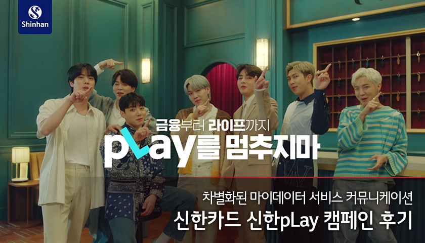 신한카드는 신한pLay에 대한 본격적인 브랜딩과 퍼포먼스 효율을 고려하면서 실체를 임팩트 있게 전달하고자 국내외 인지도가 높은 방탄소년단(BTS)를 선정하게 됩니다. 플레이라는 키워드의 활동성, 생동감을 그대로 전달하고 멤버들의 이미지에 맞춰 커뮤니케이션할 수 있도록 꾸렸습니다.