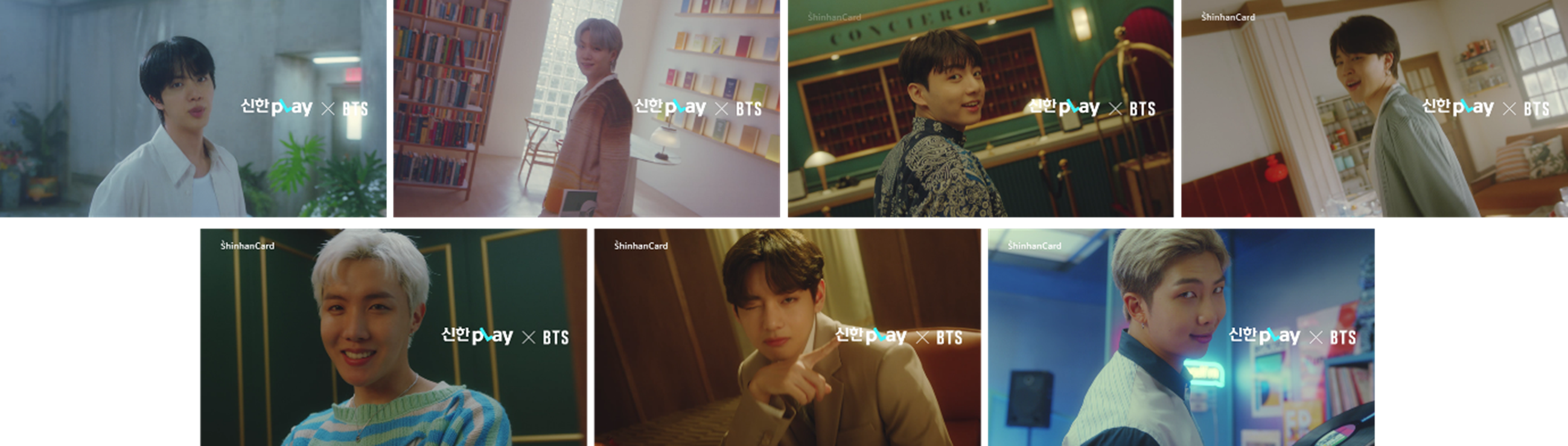 압도적으로 빠른 결제를 호텔 컨시어지에서 보여주는 정국, 본인만의 취미 공간에서 다양한 자산을 바라보며 즐기는 진, 뮤직룸에서 자동 추천되는 음반을 바라보는 RM, 자신의 방에서 소비 내역을 확인하며 여유를 부리는 지민, 커뮤니티 추천을 통해 평소 본인의 취미를 더욱 신나게 즐기는 슈가, 다양한 음식이 차려진 공간에서 본인 맞춤형을 추천받는 뷔, 신한pay로 다양한 금융서비스를 한 번에 즐기는 제이홉 등의 모습을 멤버/혜택별 특성을 담아 구성했습니다.