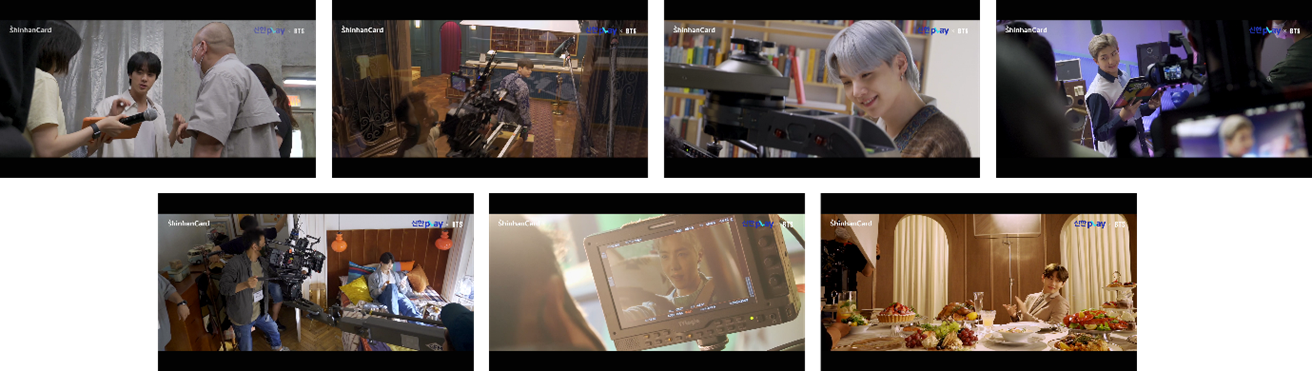 압도적으로 빠른 결제를 호텔 컨시어지에서 보여주는 정국, 본인만의 취미 공간에서 다양한 자산을 바라보며 즐기는 진, 뮤직룸에서 자동 추천되는 음반을 바라보는 RM, 자신의 방에서 소비 내역을 확인하며 여유를 부리는 지민, 커뮤니티 추천을 통해 평소 본인의 취미를 더욱 신나게 즐기는 슈가, 다양한 음식이 차려진 공간에서 본인 맞춤형을 추천받는 뷔, 신한pay로 다양한 금융서비스를 한 번에 즐기는 제이홉 등의 모습을 멤버/혜택별 특성을 담아 구성했습니다.