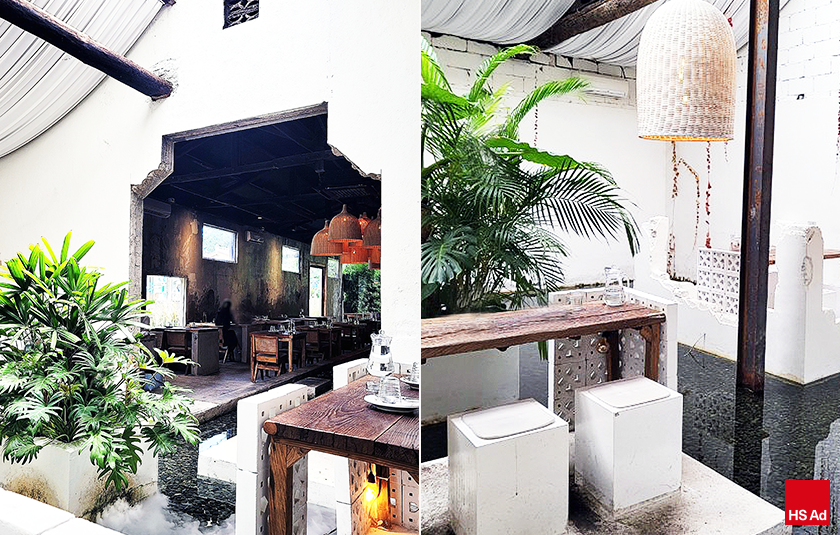 동남아 특유의 푸릇푸릇함을 연상시키는 작은 골목으로 들어가면 치앙마이방콕의 야외 공간을 만날 수 있는데요. 자유롭게 설치된 라탄 조명과 가구에서부터 현지 분위기를 자아냅니다. 특히 내부까지 이어져 있는 가운데 조성된 인공 호수와 외부 조명이 밤이면 더 매력적인 분위기를 만들어 주고 있죠. 내부는 홀 공간과 안쪽의 화이트 공간으로 나뉘어지는데요. 야외 인테리어와 이어지게 우드와 라탄조명으로 꾸며진 홀과, 마치 사원을 연상시키는 화이트 공간은 서로 상반되는 조화로운 분위기를 연출하고 있습니다.