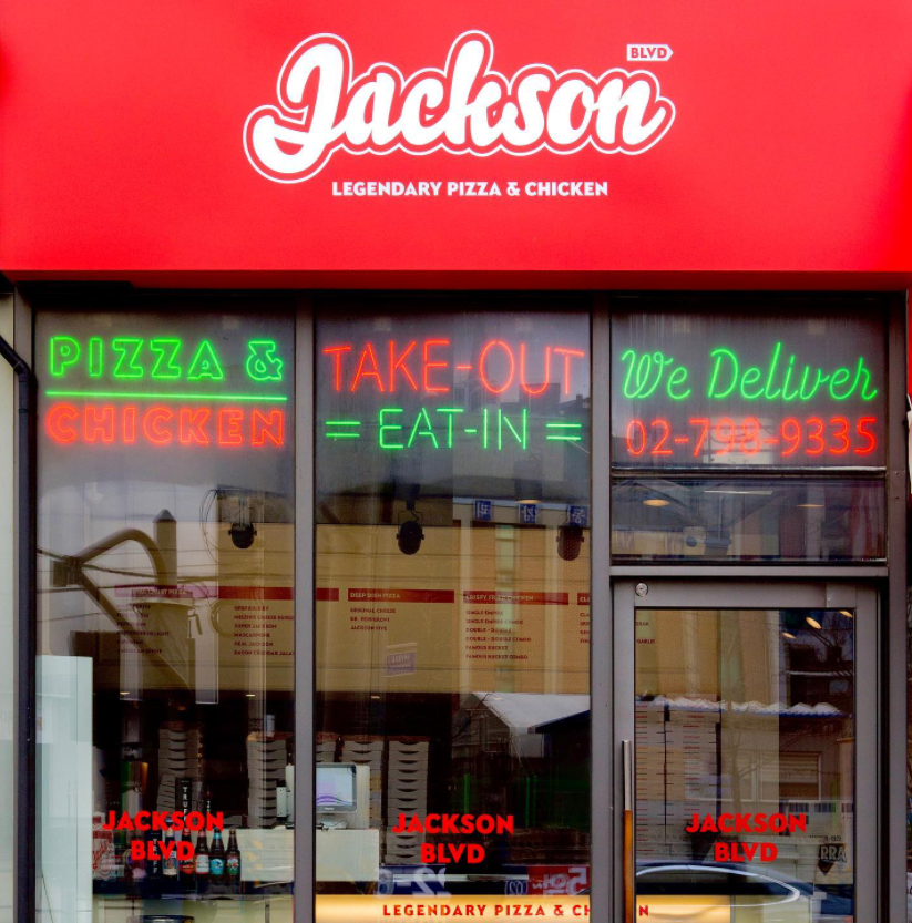 잭슨피자 초창기 때부터 유명했던 신사점, 한남점은 매장 내부를 미국 프랜차이즈 버거 가게나 피자 가게처럼 디자인하여 마치 미국에서 먹는 듯한 즐거움과 신선함을 제공했습니다. 특히, 비교적 최근에 생긴 삼각지점은 건물 하나를 통 채로 오픈했는데요. 내부 좌석 없이 To-Go 매장으로 운영되지만, 주말엔 많은 대기 줄을 자랑하고 있습니다. 서울 한복판에서 미국을 느낄 수 있다는 매력 때문일지도 모르겠습니다. 멀리서부터 눈에 띄는 큰 간판과 가게 밖 빨간색 벤치 의자에서 힙스러움이 절로 느껴집니다. 내부에 좌석이 없는데도 가게 밖 벤치에서 길맥하며 피자를 맛보는 사람도 있을 정도라고 하니까요. 지금도 인스타그램에 잭슨피자를 검색하면 삼각지점 앞에서 인증샷을 찍어 올리는 사진이 많답니다.
