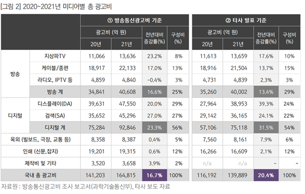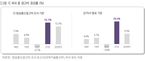 2021년 총 광고비는 2000년 이후 역대 최대 성장률을 보이며, 역대 최고 광고비 규모를 기록한 것으로 보인다. 광고비는 조사 주체의 모니터링 범위 및 방법에 따라 차이는 있지만, 방송통신광고비 조사 보고서 기준으로는 전년대비 16.7% 성장하여 약 16.5조 원으로 추정된다. 타 광고회사에서 집계한 기준으로는 20.4% 증가한 약 14조로 업계의 예상보다 상회하는 수치이다. [그림1 참고]
