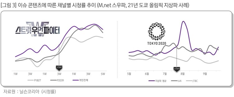 많은 이들이 몸소 체감한 것처럼 코로나19 확산에 따라 비대면 수업, 재택근무 등 집에 머무는 시간이 길어지면서 TV를 보는 시청자 수와 시청 시간 모두 증가했다. 여기에 기존 TV 콘텐츠 파워를 상징하던 지상파 3사와 tvN의 프라임타임 예능이나 드라마 외에 M.net ‘스트릿 우먼 파이터’, TV조선 ‘미스트롯2’ 및 채널A ’강철부대’ 등과 같이 팬덤이 형성되는 프로그램의 강세까지 더해져 광고주들의 TV집행을 견인하였다. [그림 3참고] 더불어 우려와 달리 도쿄올림픽이 여자배구와 양궁 등의 콘텐츠로 화제성을 만들어내며 전통적인 광고 비수기라 할 수 있는 7~8월에도 30% 이상의 지상파 광고비 성장을 보여주며 시장의 반등에 기여하였다.