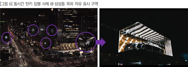 특히 삼성동 옥외광고 자유표시 구역에서 촉발된 대형 전광판 광고의 인기는 코로나19의 어려운 시기 속에서도 식지 않고 더 활성화되고 있다. 단순히 보여주기가 아닌 3D 콘텐츠 등의 다양한 신기술을 활용하여 임팩트 있게 주목을 끌고, 더 나아가 SNS 등을 통해 바이럴(Viral) 되는 경우가 많아 광고주 선호도가 점점 높아지고 있다. 또한 한 곳의 단발성보다는 여러 매체 동 시간대 광고를 노출하는(턴키 집행) 경우도 많아 캠페인 규모감 확보 및 브랜드 랜드마크 화가 되기도 한다. [그림 6 참고]