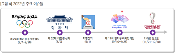 이러한 훈훈한 분위기 속에서 2022년에는 베이징 동계올림픽, 항저우 아시안게임, 카타르 월드컵 등의 대대적인 스포츠 행사와 3월 대통령 선거 등의 빅 이벤트 호재들이 방송광고 시장의 성장을 이끌 것으로 기대된다. [그림 4참고] 또한 2021년 광고 수익이 다시 방송 콘텐츠 투자로 이어지는 선순환 구조가 만들어져 올해 역시 5% 이상의 성장을 기대해 본다.