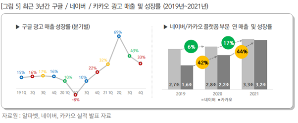 구글 코리아의 국내 실적 발표는 없지만, 알파벳(구글)의 글로벌 총매출(2021년 약 300조)중 약 80%를 차지하는 광고 매출을 살펴보면 코로나 이전 대비 크게 레벨 업 되었고, 네이버, 카카오 모두 플랫폼 부문 기준 사상 최대 실적을 갱신한 것을 보더라도 코로나 이후 디지털 광고 시장의 성장이 더욱 빨라지고 있음을 알 수 있다. [그림 5참고]