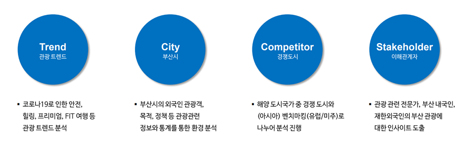 HS애드의 이미 검증된 서울시, 경기도 브랜드 아이덴티티 개발 노하우를 바탕으로 시민 참여형 브랜딩 프로세스를 수립하고 추진했습니다. 특히 3C 분석을 관광 브랜딩에 맞춰 변형시킨 TCCS 모델을 통해 트렌드, 부산시, 경쟁 도시 브랜드, 이해관계자 이미지를 분석하여 부산 관광 브랜드 정체성 키워드 도출에 활용했습니다.