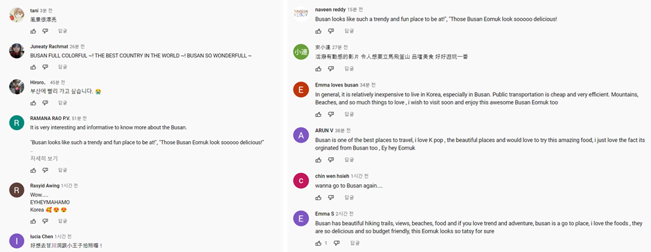 실제로 해당 콘텐츠에 달린 글로벌 댓글을 보면 “부산에 가면 재미있는 일이 일어날 것만 같다.”, “이전에 갔던 한국이 떠오른다. 이번엔 부산에 꼭 가보고 싶다.”라는 다수의 반응처럼 부산에 대한 관심이 높아진 걸 알 수 있었습니다.