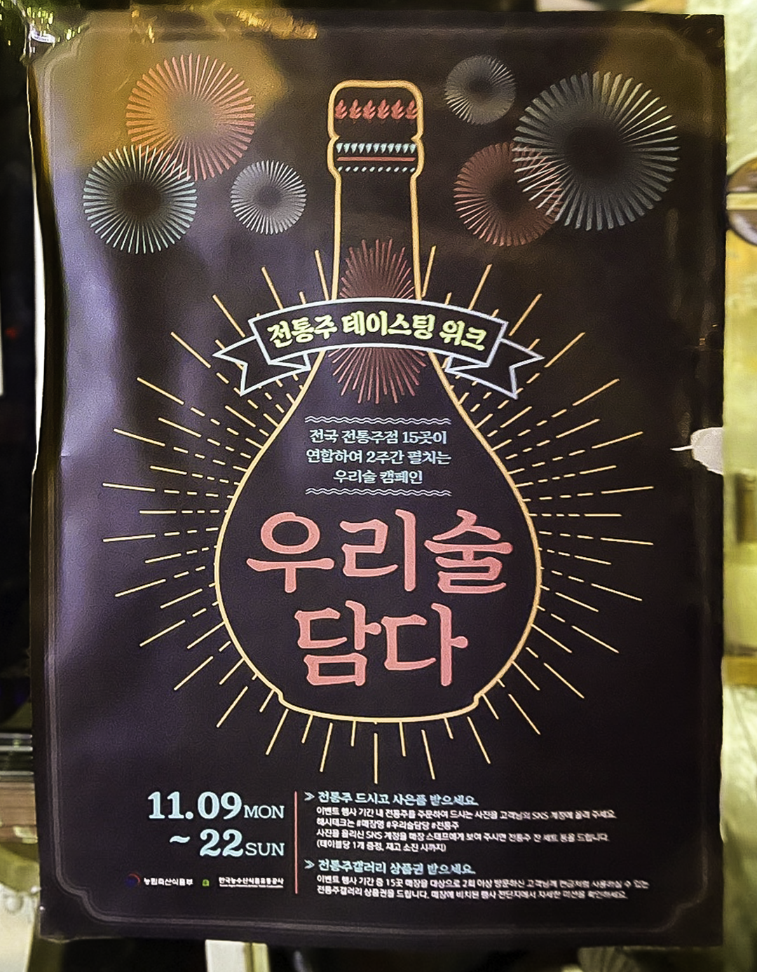 와인은 우리가 흔히 느끼는 서양의 이미지처럼, 포장의 역사라면, 우리 술의 매력을 한마디로 표현하면 ‘솔직함’이라고 할 수 있어요. 외국인들이 한국을 좋아하는 이유도 직설적이고, 간단명료하기 때문이고, 막걸리 한잔에 담긴 동질감과 털털함이 한국인의 민족성이라고 할 수 있지 않을까요? 우리 술만큼 매력적이고, 재미있는 술이 없습니다. 후배 세대들이 봉준호, 박찬욱, 김기덕 감독이 칸과 베니스에 입성했듯 무한한 가능성을 가진 우리 술의 세계화에 앞장서줬으면 하는 바람입니다. 술맛이 그 맛이 그 맛이라 생각될 때 우리 술 한잔 어떨까요?