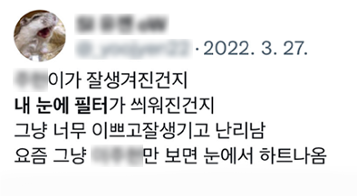 요즘 MZ세대는 '눈에 콩깍지가 씌었다'라는 말 대신에 '필터 씌었다' '필터 꼈다'라는 말로 대체하여 표현한다고 합니다.