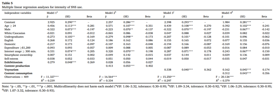 A. 이 연구는 미국 소셜 미디어 사용자 409명의 대학생을 대상으로 한 설문 연구로, 학생들의 심리적인 성향에 따른 소셜 미디어 몰두 정도를 다중회귀분석 방법으로 분석했습니다. 이 연구는 자신을 적극적으로 드러내는 성향 (exhibitionism)이 높은 사용자일수록 컨텐츠를 자주 업로드하고 타 컨텐츠에도 적극적으로 반응하지만, 소극적으로 숨어 보는 성향 (voyeurism)이 높은 사용자들은 컨텐츠를 자주 업로드하지 않고 타 컨텐츠에도 소극적으로 반응한다는 사실을 증명했습니다.