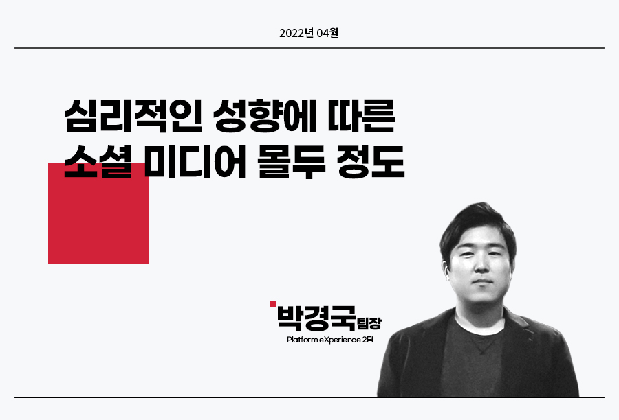 박경국 팀장은 이외에도 2020년 SSCI급 저널인 Int. J. of Mobile Communication에 ‘Social network services and their effects on network social capital: an instrumental variables approach’ 논문을 공저자로 게재했고, 지금까지 New Media & Society, Social Indicator Research, Korea Observer 등의 SSCI급 국내외 저명 학술지에 총 8편의 논문을 게재한 경험이 있습니다. 앞으로도 이러한 연구 성과를 토대로 고객 경험 관리 측면에서 활용할 수 있는 다양한 솔루션들을 제시해 주기를 기대해 봅니다.