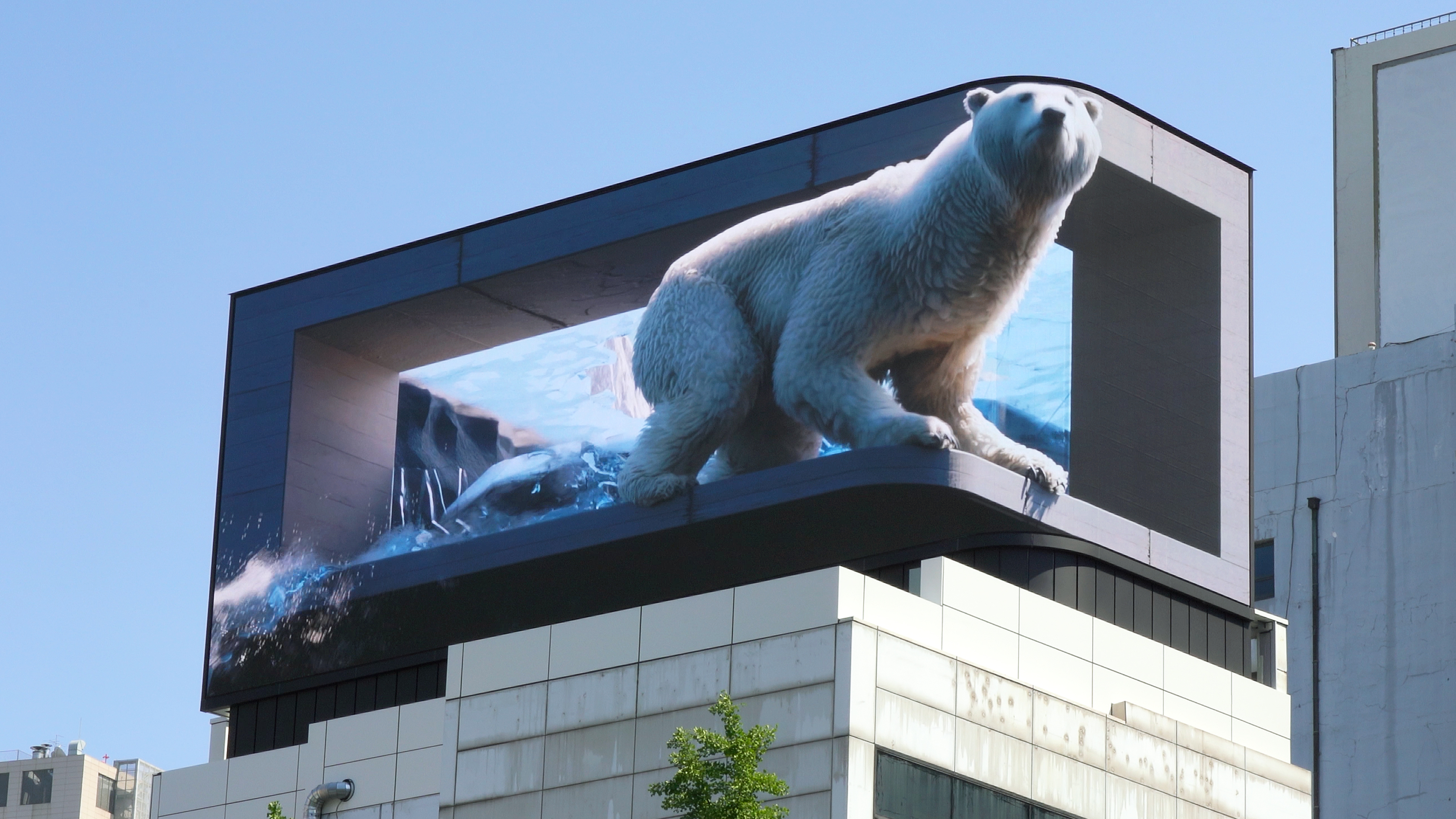 5일 서울 시청역 인근 건물 옥상 전광판에 물에 빠진 대형 북극곰이 마치 눈 앞에서 허우적대다 포효하며 다시 물위로 올라가는 듯한 영상이 등장했습니다. 이 영상은 착시 효과로 시민들의 눈길을 끌었습니다.
