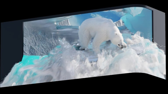 영상제작에 가장 고민이 많았던 3D 콘텐츠 전문기업 힉스의 손원상 대표가 이를 극복하기 위한 획기적인 아이디어를 내놓았습니다. 바로 전광판의 하단부를 가상의 공간으로 뻗어 나오게 변경함으로써 실제 전광판 앞에 추가적인 공간을 확보하는 것입니다. 이 부분이 바로 아나몰픽 착시효과가 주는 최고의 ‘속임수’입니다. (맨 아래 사진의 북극곰이 서있는 부분과 윗부분을 비교해보시기 바랍니다.) 이를 이용하여 상부의 태양조명에 따른 음영 효과, 전광판 하단부에 가상의 공간을 만들었으며, 북극곰의 모션을 실제 전광판의 바깥쪽 가상공간으로 빼낼 수 있게 하여 입체감과 아나몰픽 효과를 극대화했습니다.