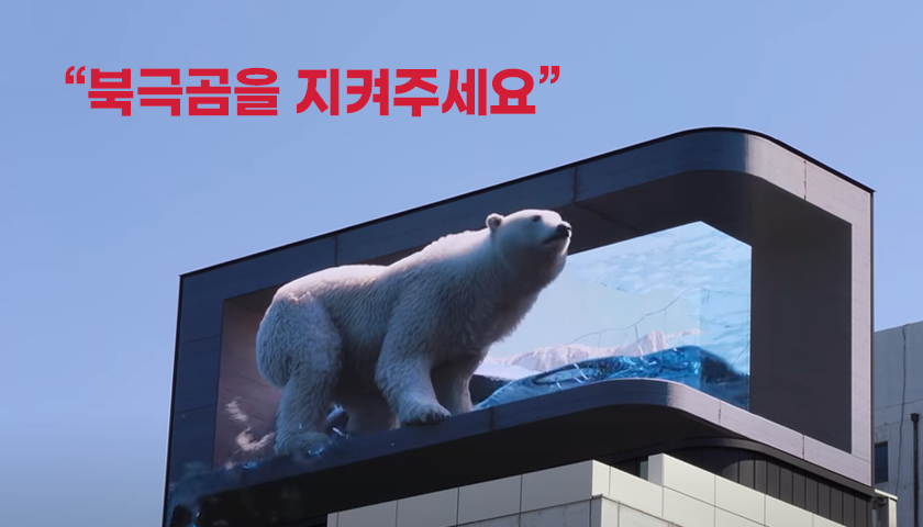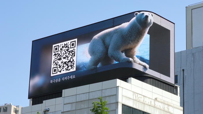 북극곰 아나몰픽 3D 영상은 HS애드 앰비언트 솔루션팀에서 수행한 1년여에 걸친 장기 프로젝트인 디지틀조선 신규 LED 전광판 제작 프로젝트의 한 부분으로 기획됐습니다. 앰비언트 솔루션팀에서는 기존의 평면 전광판을 리뉴얼하여 라운드형 LED 전광판으로 교체하는 공사를 진행했고, 완공된 LED 전광판을 옥외 광고 매체로 판매하여 광고를 집행했습니다.