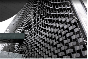 한국의 몇몇 건축설계안에도 있는 톰 메인 (Thom Mayne)의 몰포시스(Morphosis) 건축사무소는 주로 건축물의 입면에 단위 유닛의 패턴이 파도처럼 흐르는 변화의 순간을 표현하는 파라메트릭 디자인(Parametric Design)을 이용하여 기존에 상상하지 못한 환상적인 건축설계안을 만든다. 대학교 건물인 이곳은 단순한 사각형 아치로 외부 형태를 만들고 건축물 내부 벽면은 파라메트릭 패턴을 넣고 그 비워진 내부 공간은 또 다른 자유로운 형태의 매스를 넣어서 여러 다양한 공간의 구성을 나타낸다. 이곳의 건축을 보면 공간이 사용하는 사람을 지배한다는 말이 맞을 수밖에 없다는 생각이 든다.