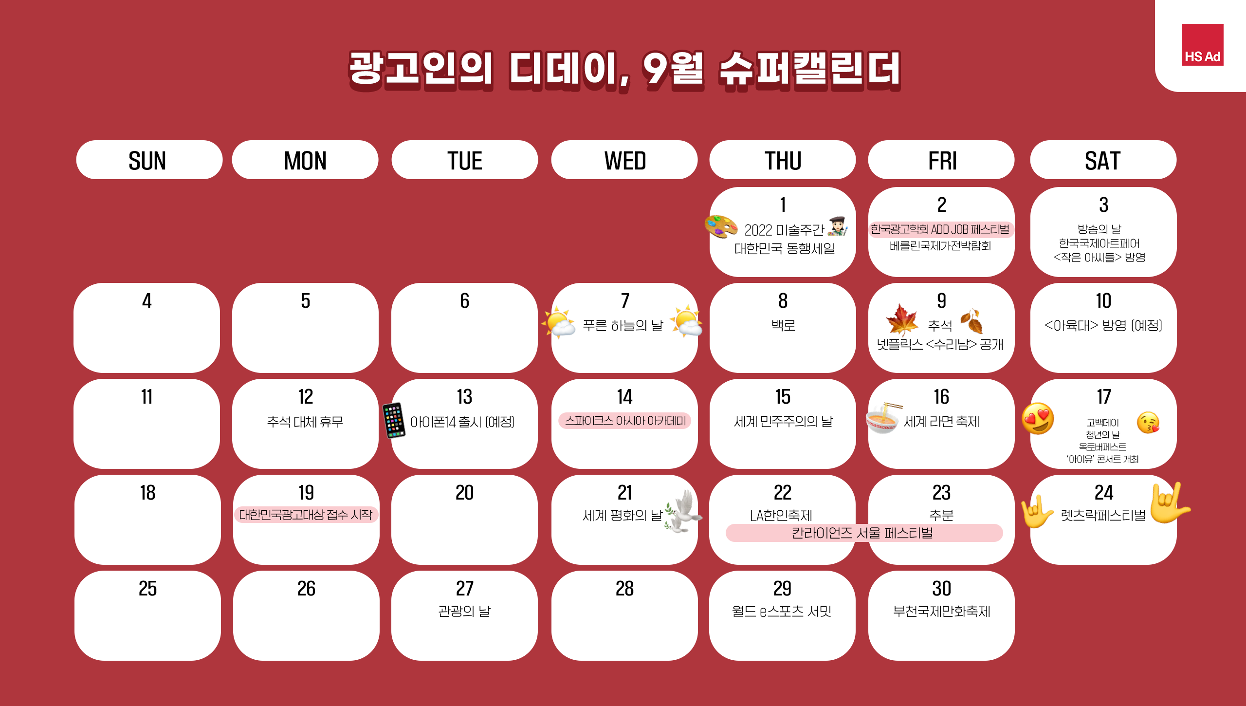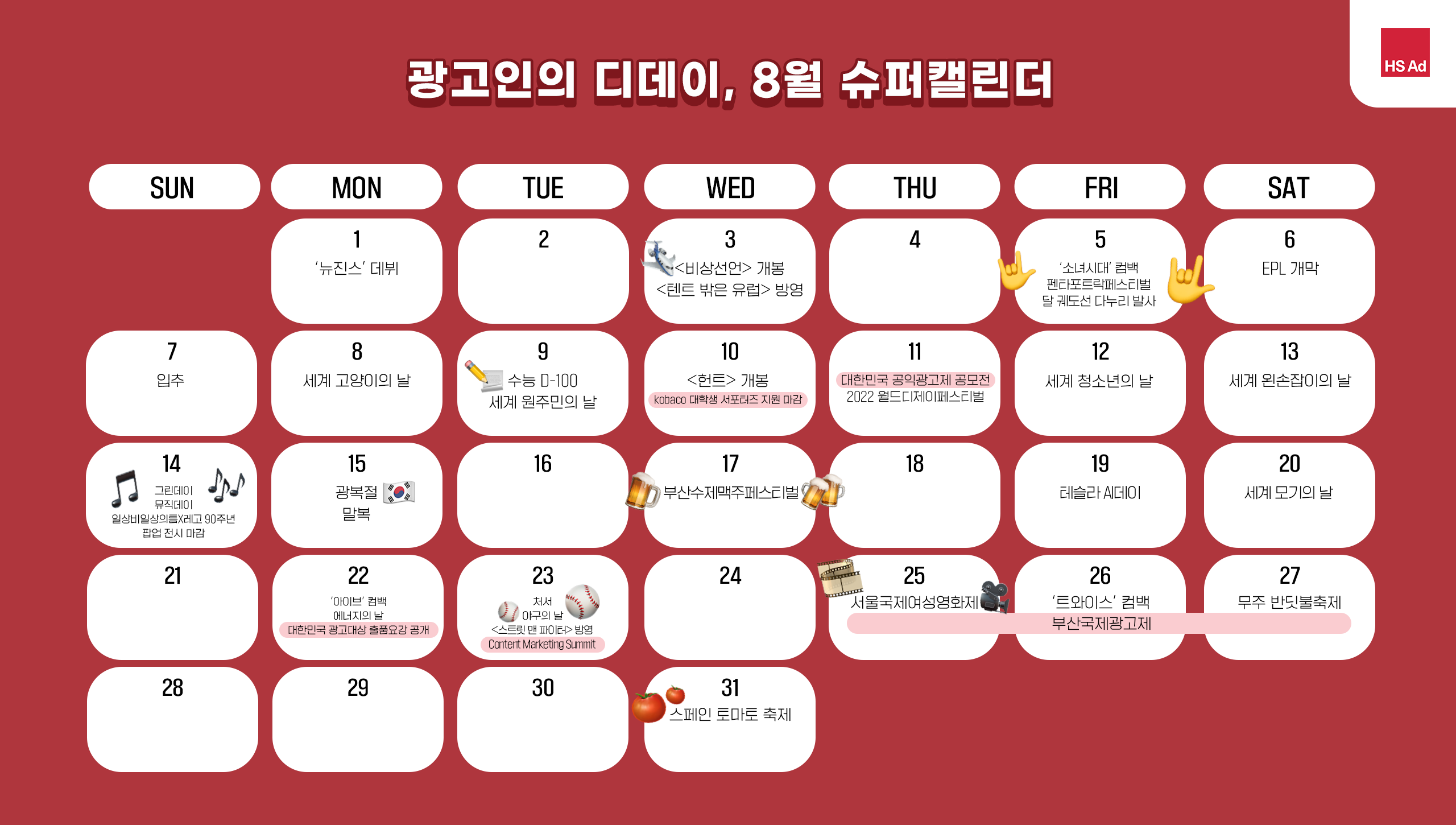 | [HS슈퍼캘린더] 광고인이라면 알아두어야 할 10월의 디데이 🚀 (0) | 2022.09.13 |