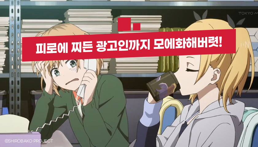 ‘모에 요소’라는 말에 대한 정확한 해석은 분분하지만, 일단 ‘빠져들게 만드는 매력 포인트’ 정도로 이해하시면 됩니다. 오타쿠는 자신이 ‘모에’하는 캐릭터의 굿즈, 피규어, 음원, 이벤트를 위해 아낌없이 돈을 씁니다. 정교한 세계관, 치밀한 복선, 독창적인 스토리에 귀중한 러닝타임을 소모하는 짓은 내가 ‘모에’하는 캐릭터가 마음껏 매력을 발산하는데 오히려 방해가 됩니다. 결국 ‘바퀴벌레’<고키챠>나 ‘적혈구’<일하는 세포>까지도 모에화하는 수준에 이른 일본 애니메이션 업계는, 한국 중소기업보다 못 미치는 박봉을 받으며 과중한 야근과 스트레스에 시달리는 자신들의 모습마저 모에화하는데 성공합니다. 그게 바로 ‘애니메이션을 만드는 애니메이션’ <시로바코>입니다.