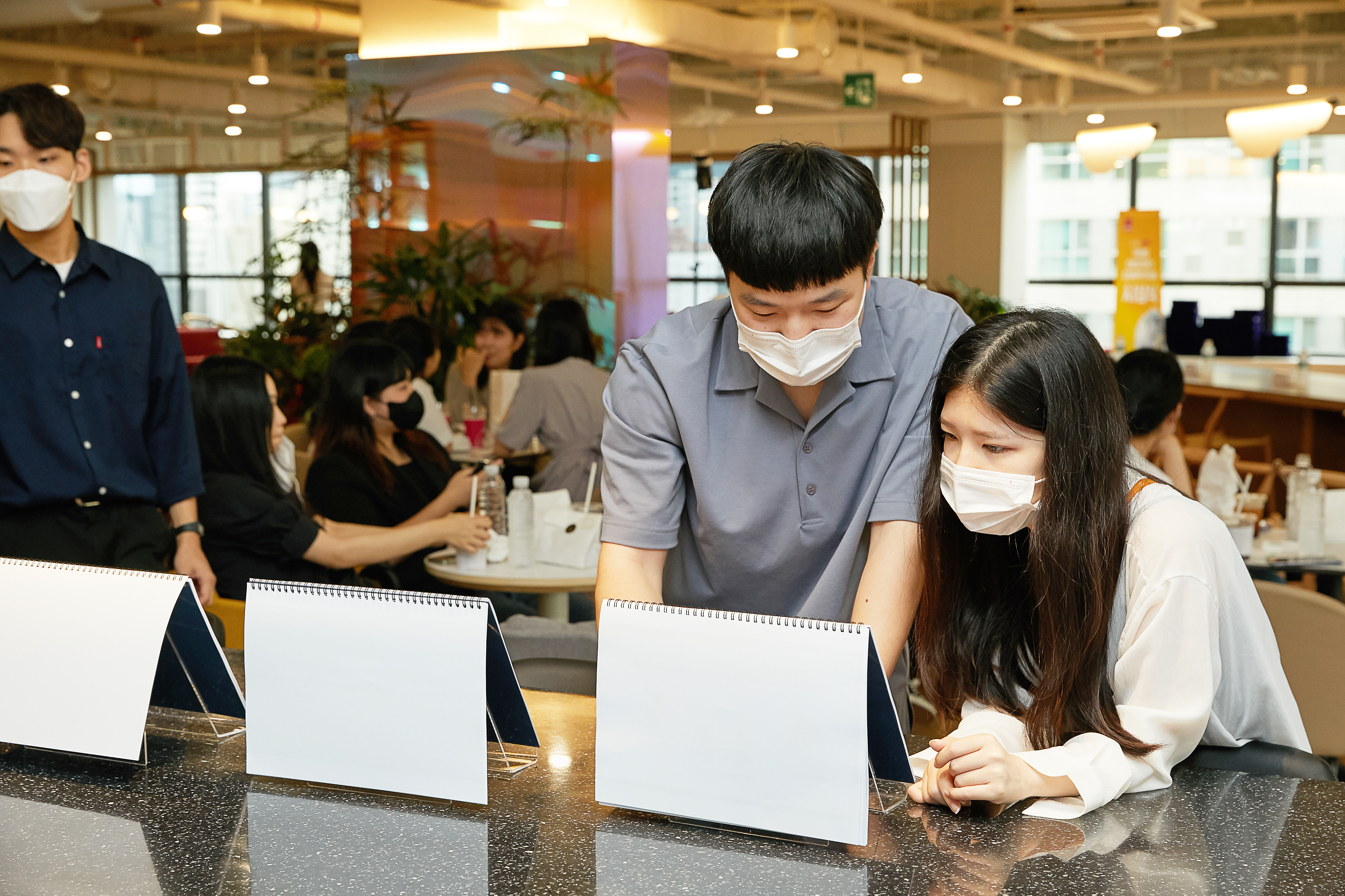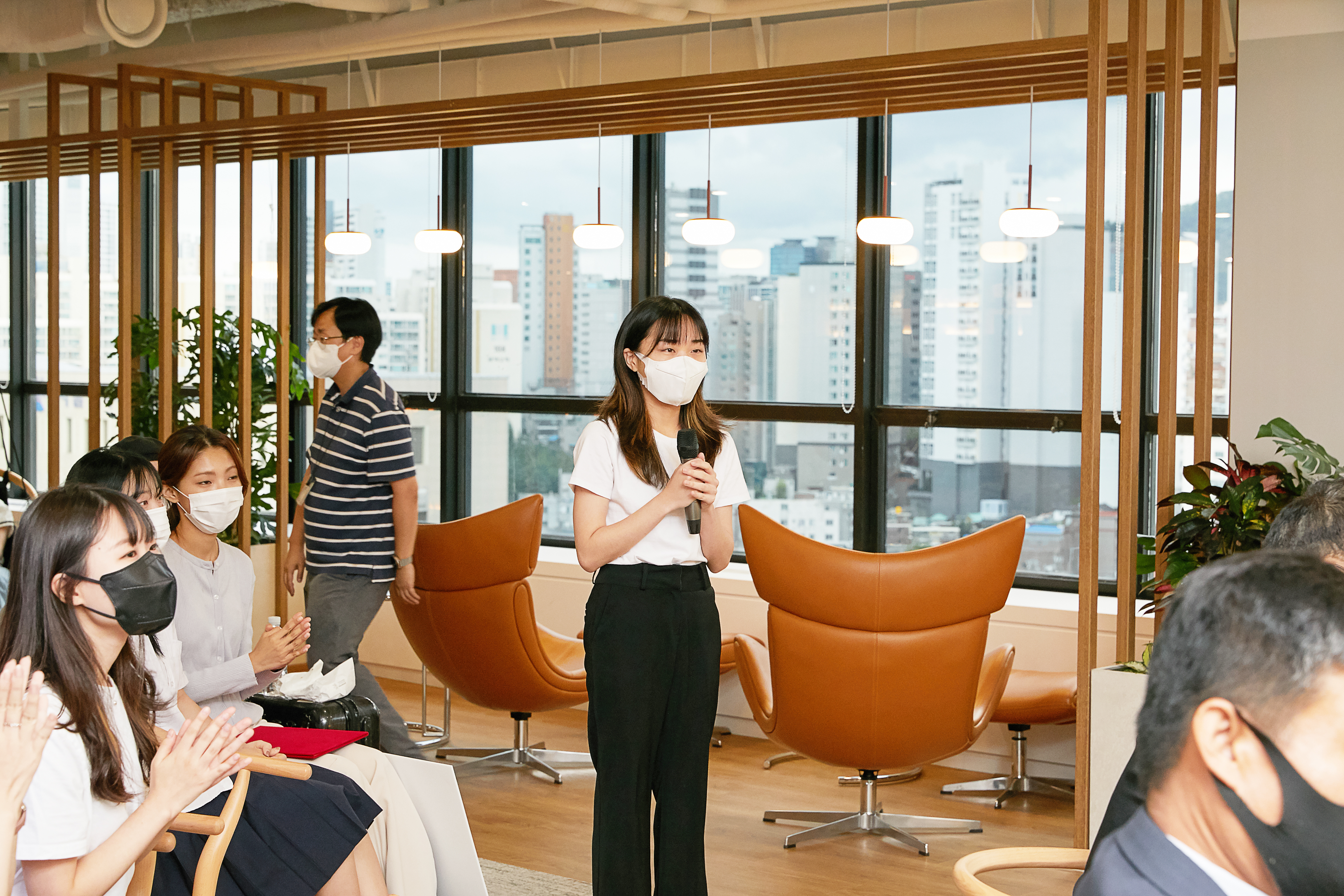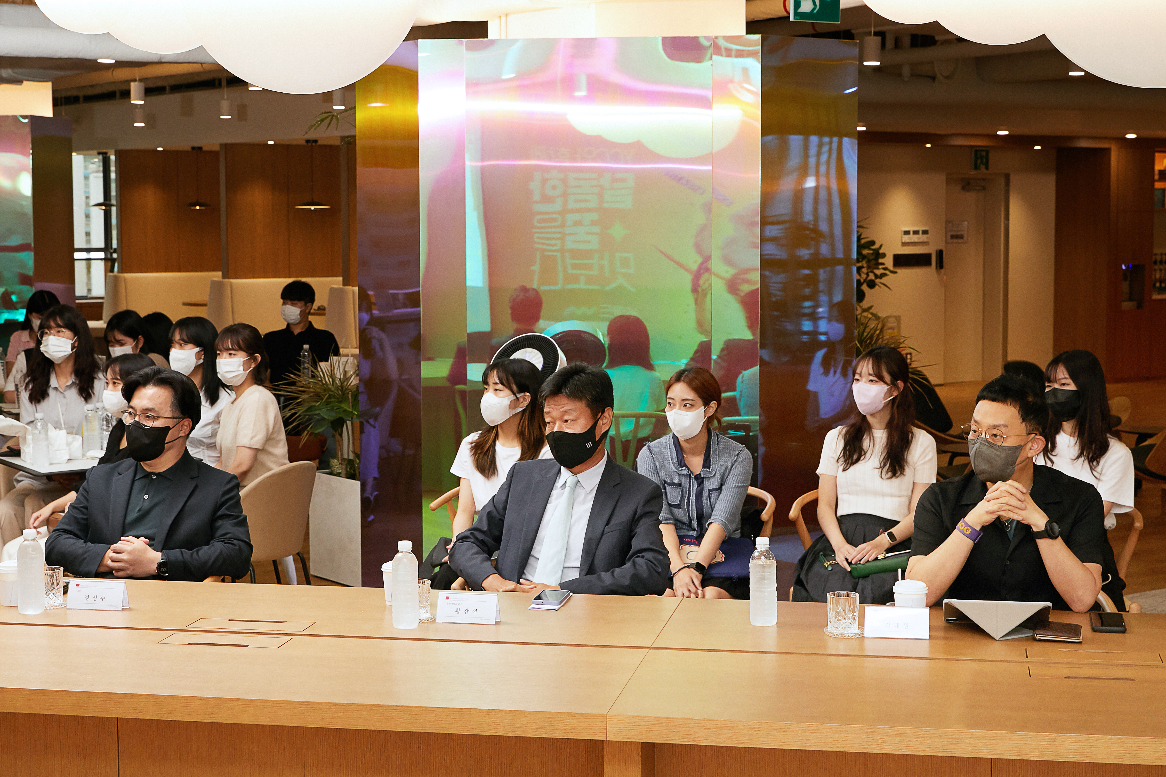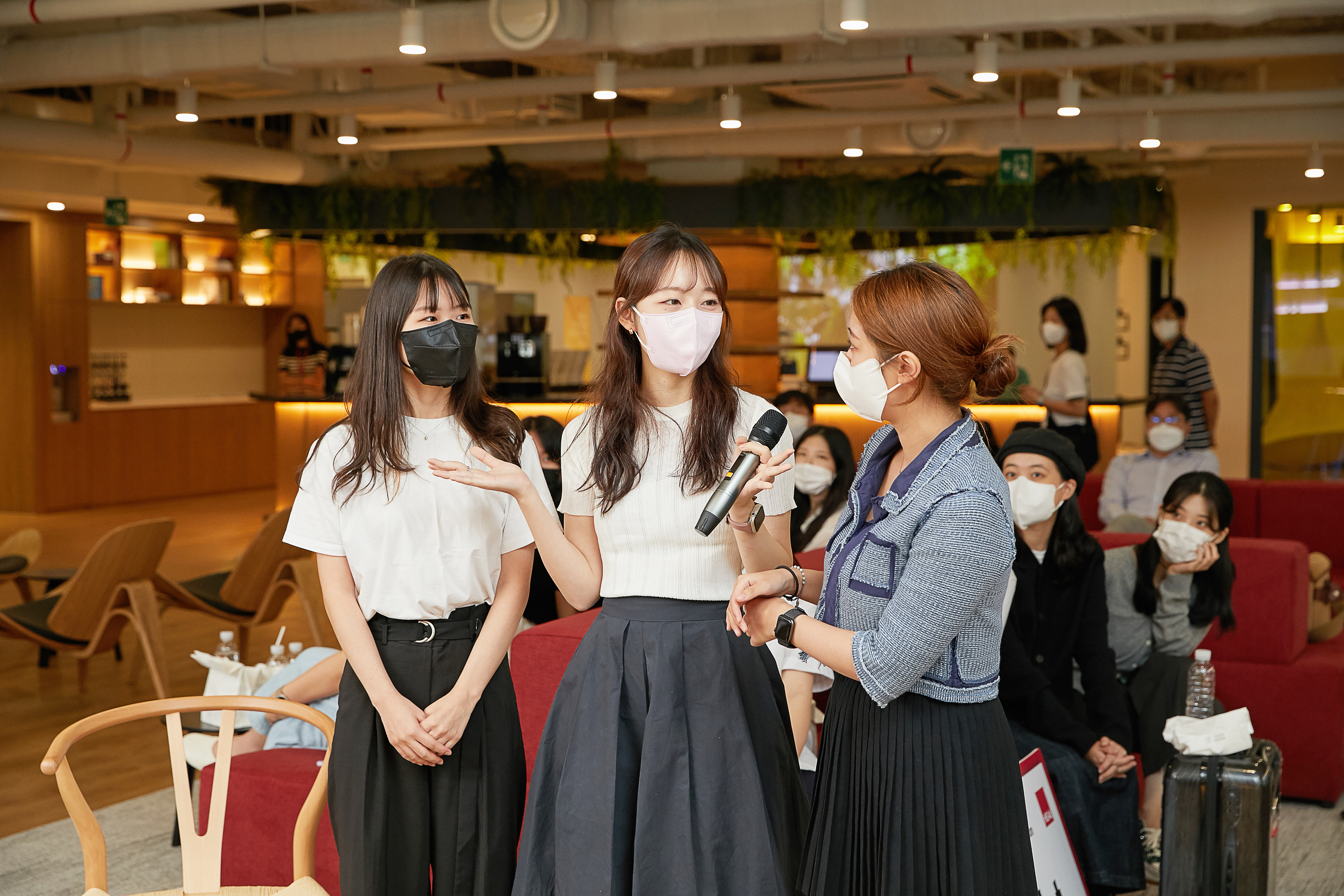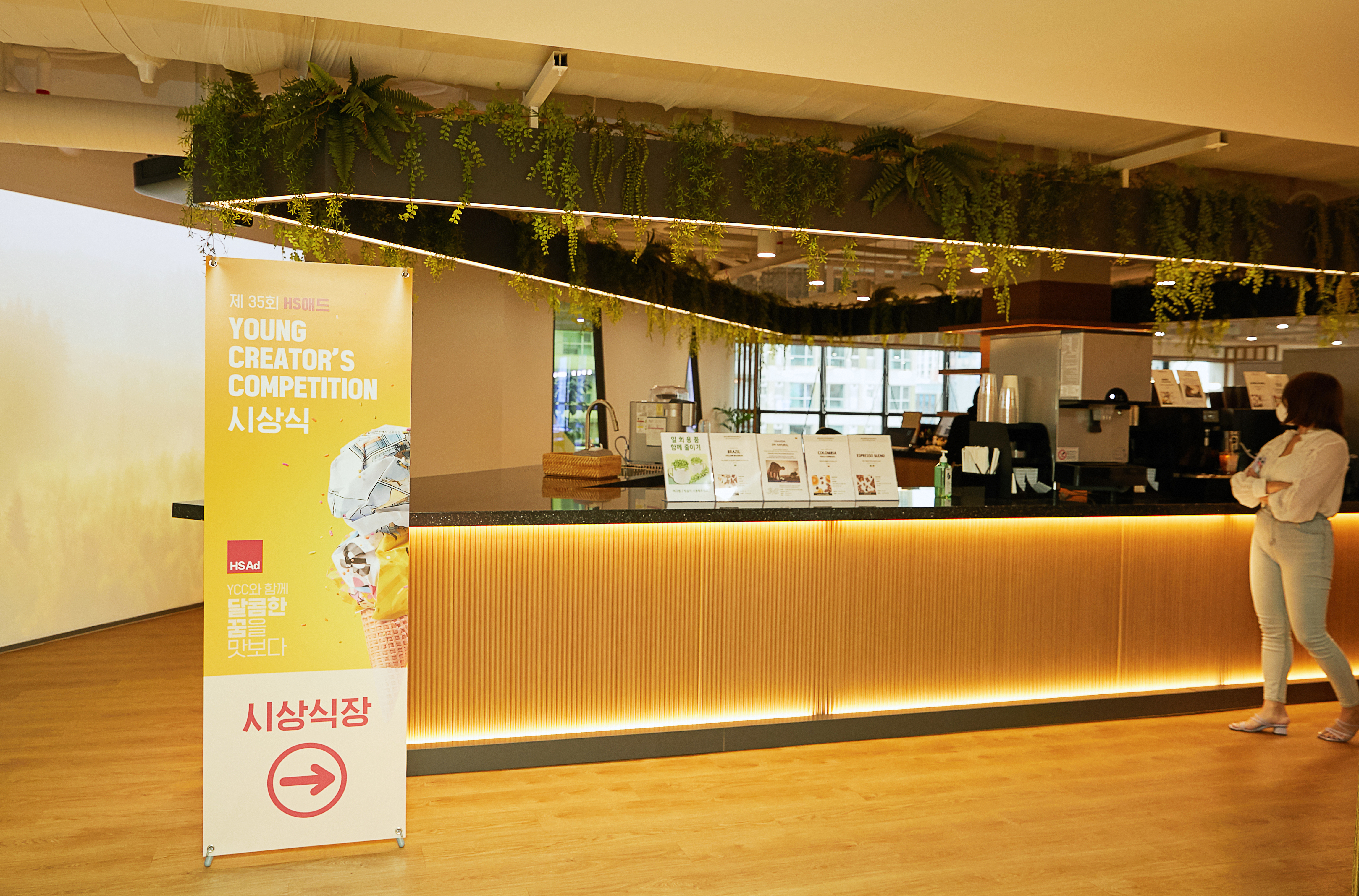 시상식은 HS애드 건물 15층에서 진행됐습니다. HS애드 15층은 넓고 쾌적한 공간으로, 다양한 회의실과 커피나 와인을 마시며 쉴 수 있는 쉼터로 구성되어 있어 직원들의 사랑을 듬뿍 받는 공간이라고 합니다. 이 날 15층 한편에는 공모전 수상자들을 위한 물과 간식도 준비되어 있었고, 카페테리아에서 커피도 자유롭게 이용할 수 있었습니다.